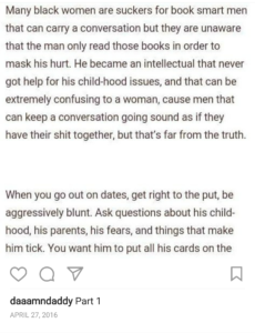 See, I had already identified my problem pattern when it came to men. I liked intellectual assholes. You know the type, they can hold a conversation about any topic you’re interested in & the moment they know something you don’t, they wanna make it a teachable moment and make you feel like a toddler instead of their equal. Am I the only one?